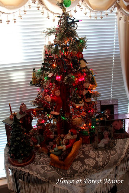 This outdoor themed tree is in the same bedroom with the toy tree. It has lots of little red, Coleman-style lanterns, pine cones, and bird houses. I also see some watering cans and a straw hat for gardening. Susie and her husband are both avid gardeners. He grows lots of fresh vegetables in the summer, and she grows beautiful flowers and shrubs. We've been invited to visit again in the spring and summer when everything is in bloom -- more good material for a future post. :)