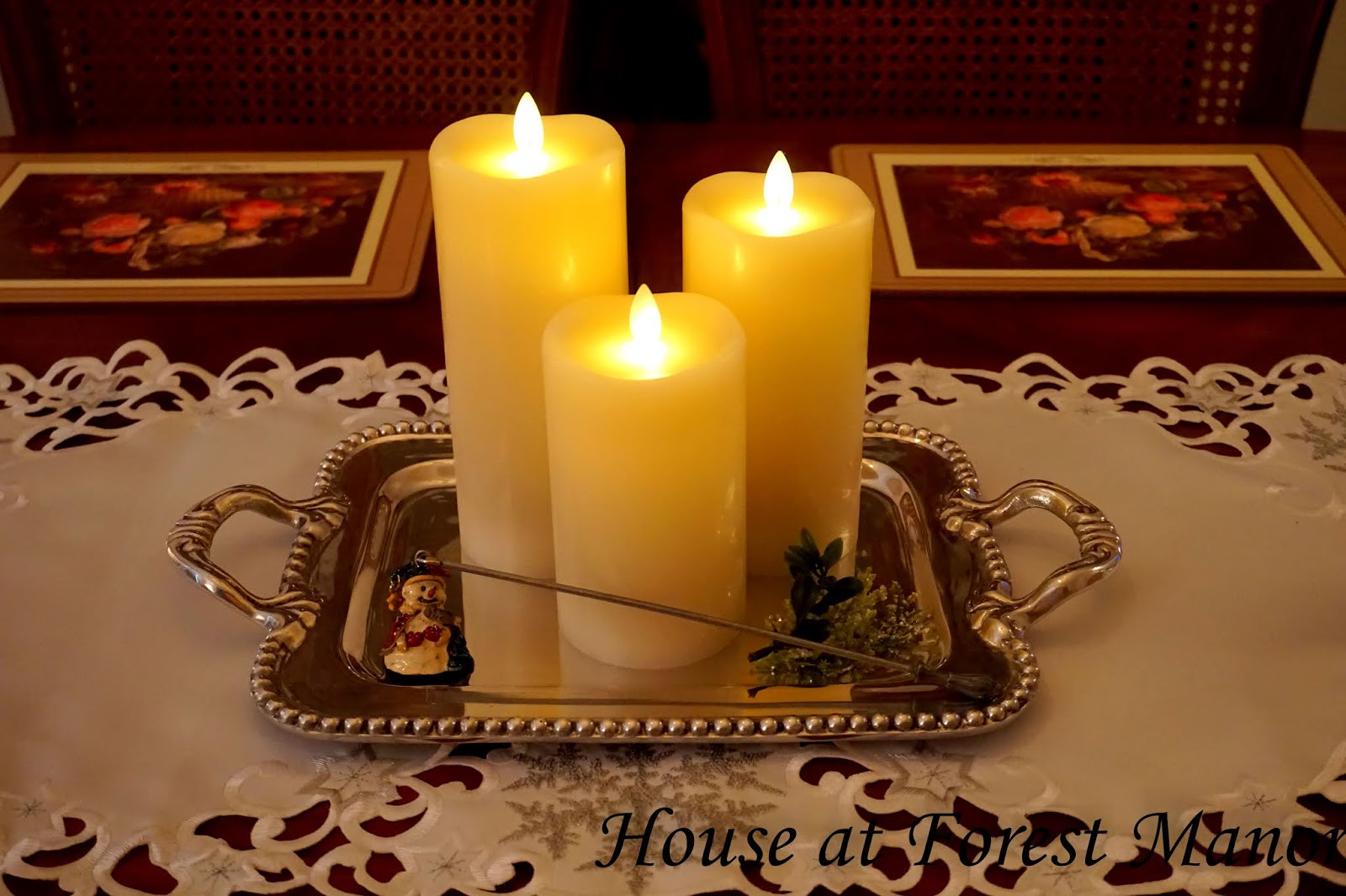 I put away the brass candlesticks and got out my crystal ones, adding the glitter tree candles my mom gave me years ago. I also used these in that first tablescape.